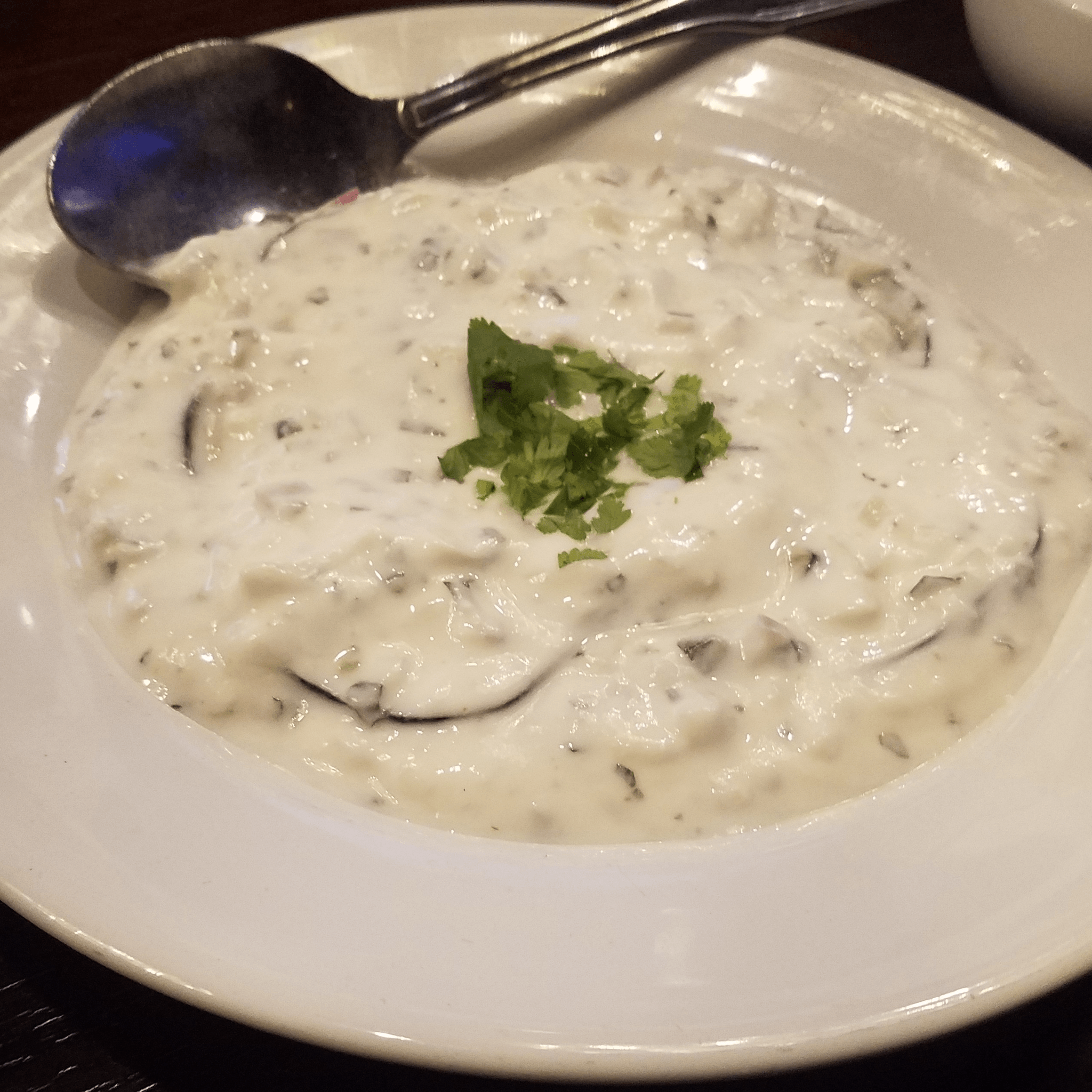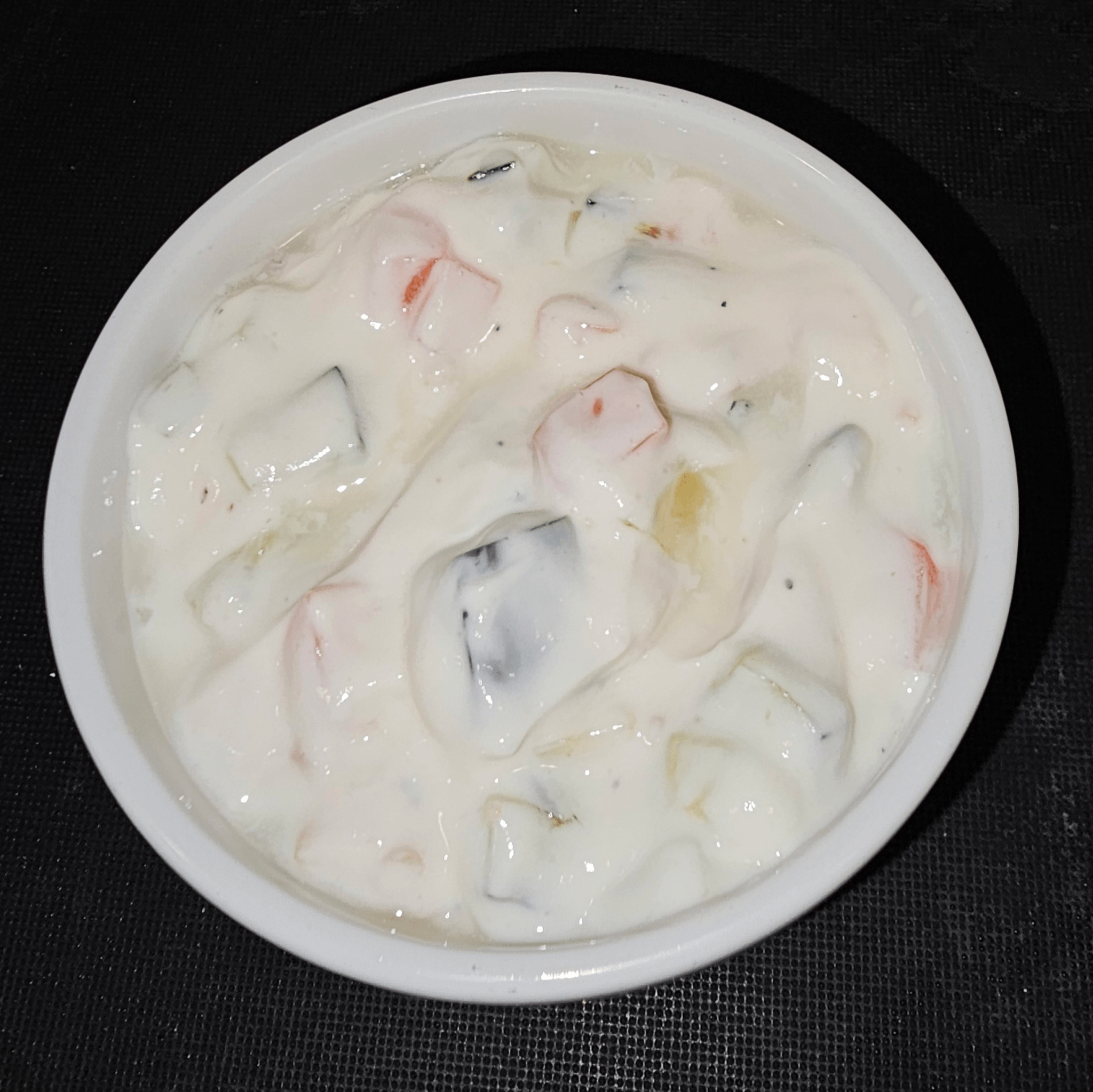 Diced cucumber, tomato and potato in a mildly spiced yogurt