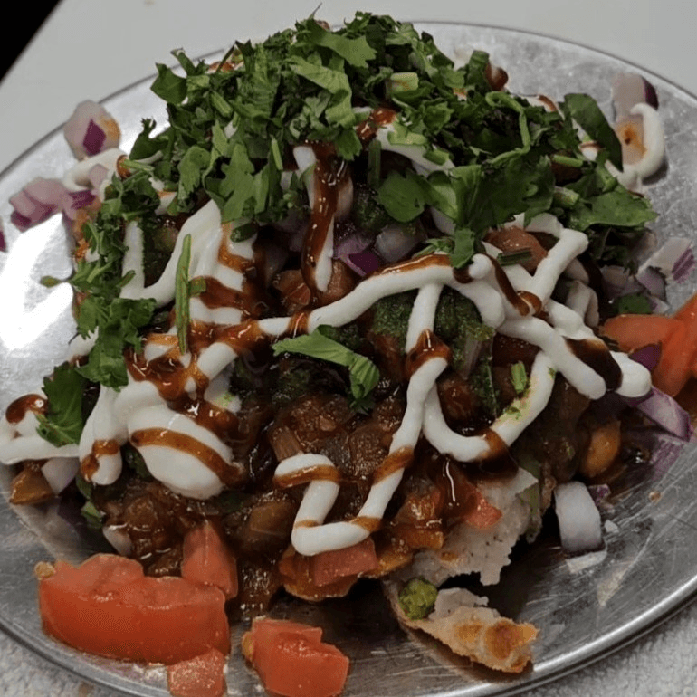 Samosa topped with tomato, onion, chana masala, variety of chutney's- tangy, sweet, spicy