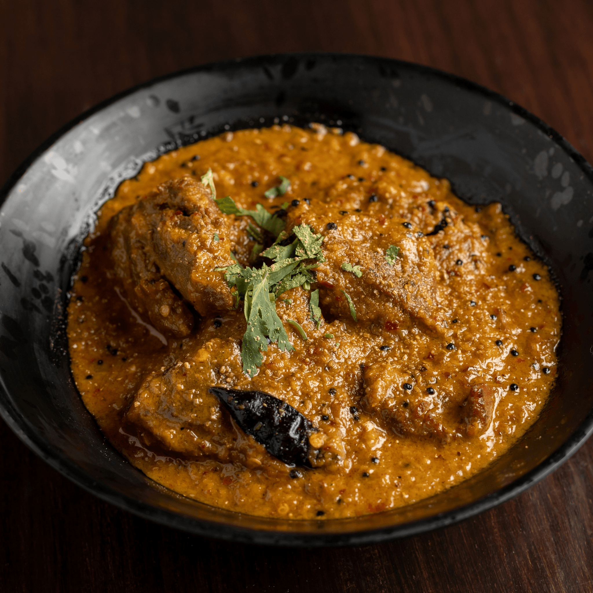 Chicken, marinated with spices, ginger, garlic, and serrano, stir-fried with curry leaves.
