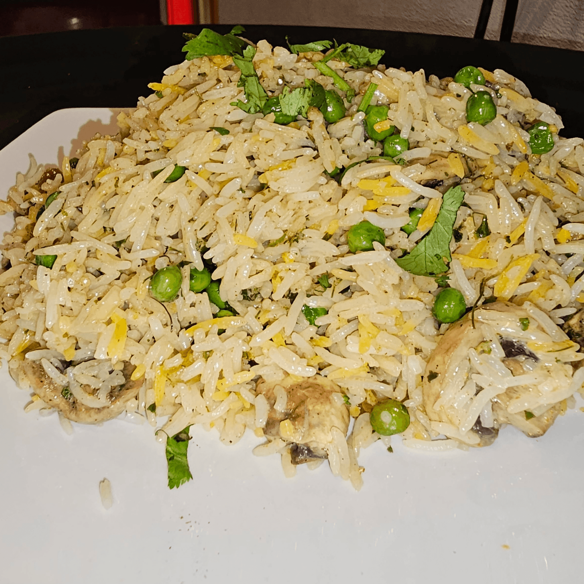 Basmati rice cooked with fresh green peas, cremini & button mushrooms, almonds & raisins